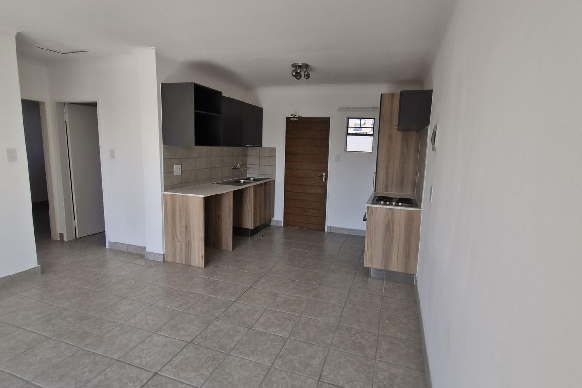 2-bedroom, 1-bathroom apartment in Kempton Park with open-plan kitchen, lounge, balcony, and 2 covered parking spaces.
