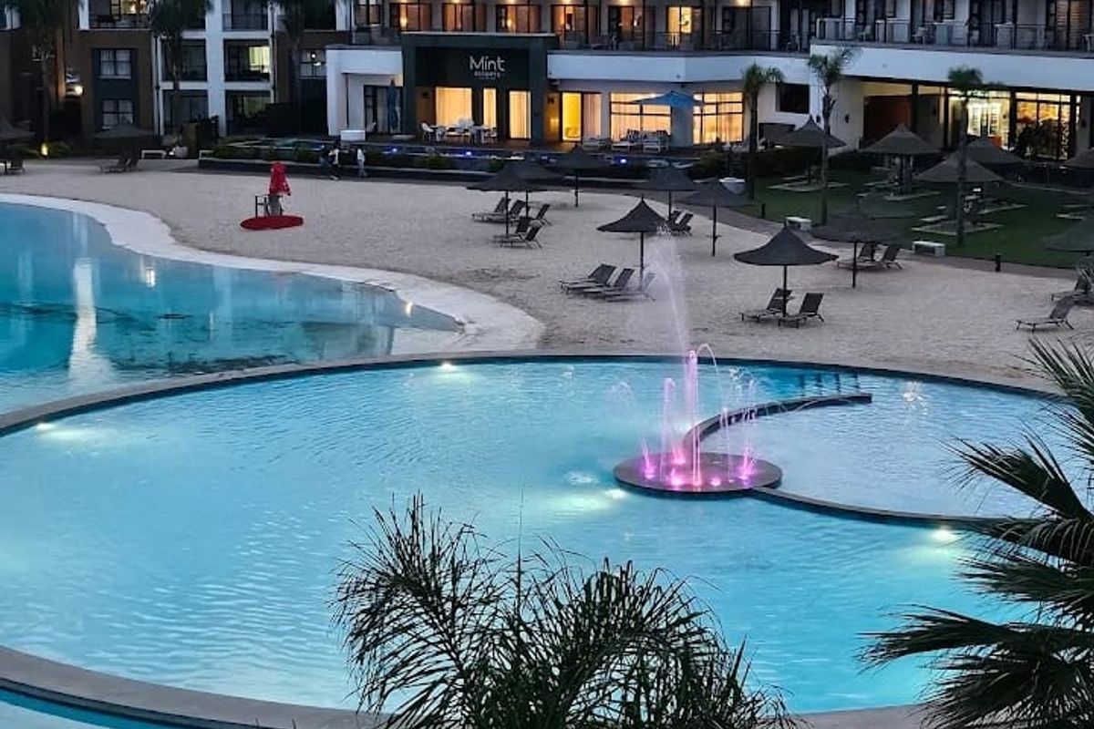 Lagoon-front resort living in Pretoria East at Blyde Crystal Lagoon, with double balcony, fully fitted modern kitchen, leisure facilities and one-bedroom, one-bath apartment with covered parking.