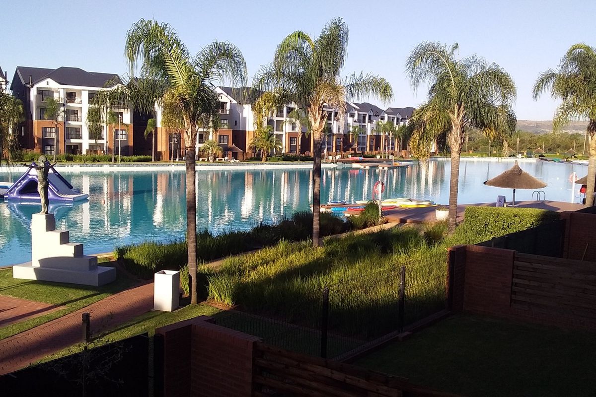 Resort-style living in The Blyde Riverwalk Estate, Pretoria — first-floor, fully furnished 3-bedroom, two-bath apartment with private balcony overlooking the crystal-clear lagoon, modern kitchen and lifestyle amenities.