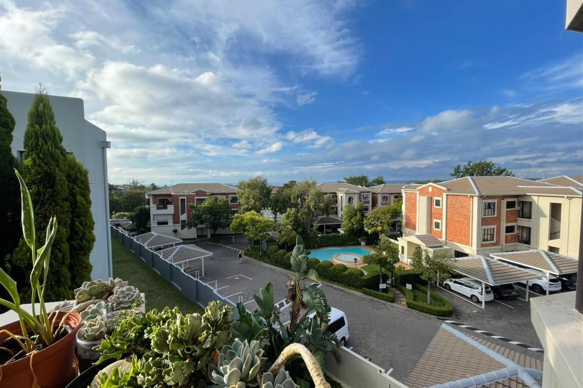 Relax in a light-filled top-floor Bryanston apartment across from The Campus, walking distance to Microsoft — private balcony with open views, communal pool, inverter, two bedrooms, two baths.
