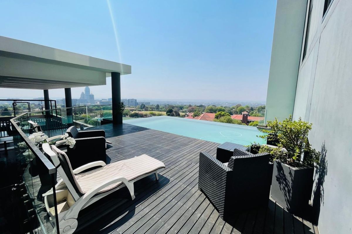Enjoy urban entertaining and quick Sandton access in Illovo Central, fronting Rivonia Road, with a large patio offering spectacular views and communal pool; three bedrooms, 3.5 baths, two parking.