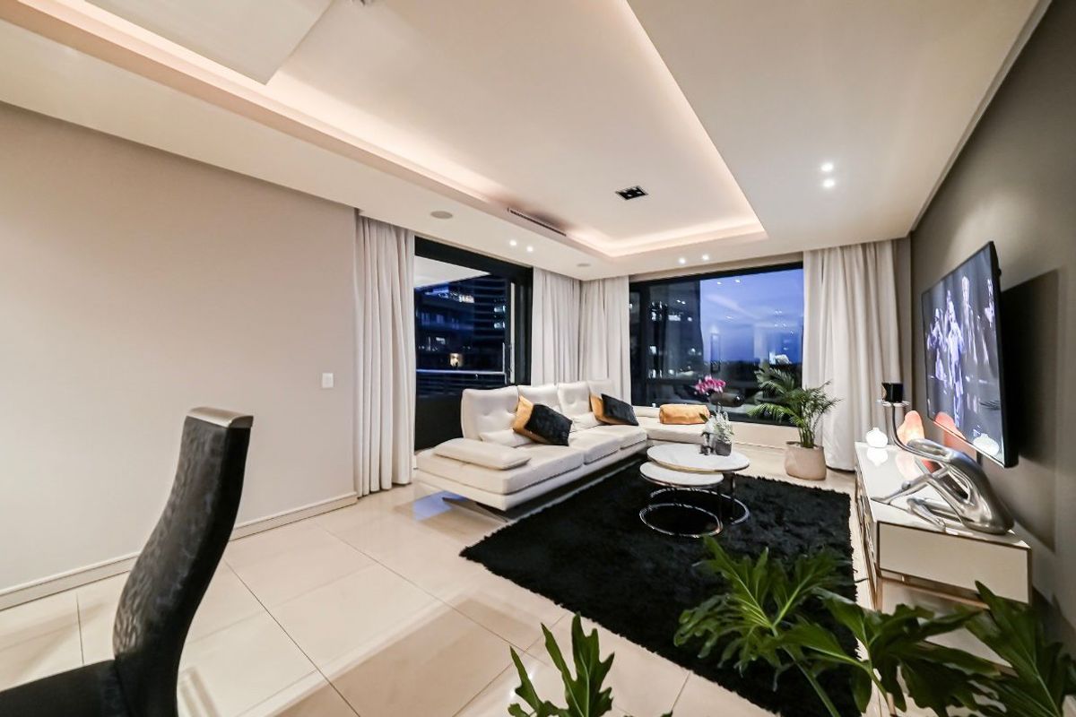 City-edge living in Morningside, steps from Sandton City and Nelson Mandela Square, with private lift, Miele kitchen, indoor pool and balcony skyline views; two bedrooms, 2.5 baths, two parking.