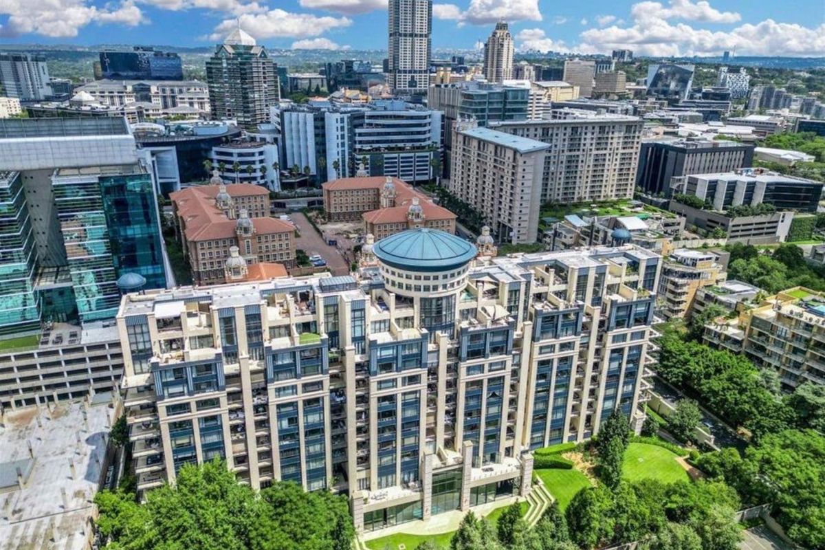 Executive living with garden and Sandton CBD views, private lift into a bright open-plan apartment with wraparound balcony and modern Miele kitchen; two ensuite bedrooms.