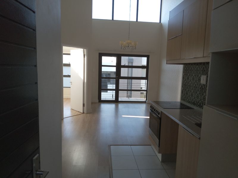 Relax in sunlit open-plan living with a skylight and balcony in serene Rivonia, walking distance to a mall and Gautrain bus — two bedrooms, one bath, parking.