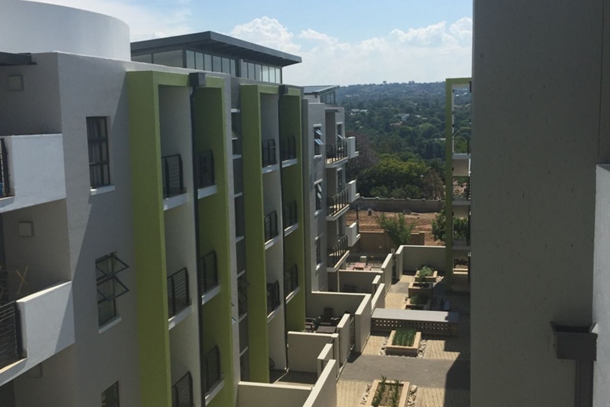 City-edge living with cafés, gyms and Gautrain bus access on your doorstep in Rivonia; ground-floor open-plan apartment with granite kitchen, communal pool, one bedroom and basement parking.