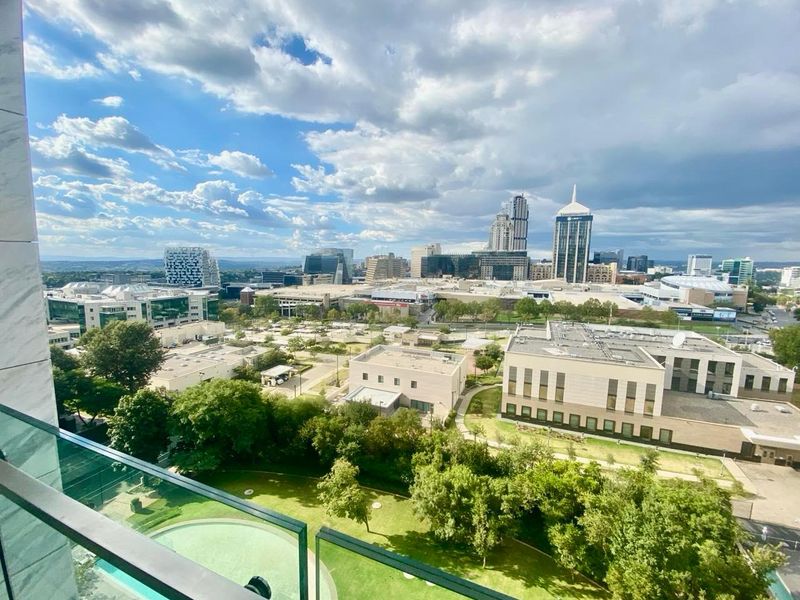 Experience Sandton Central living steps from Sandton City and Gautrain — renovated executive apartment with two bedrooms, two bathrooms, private balcony and elevated city views, modern kitchen, pool and secure parking.