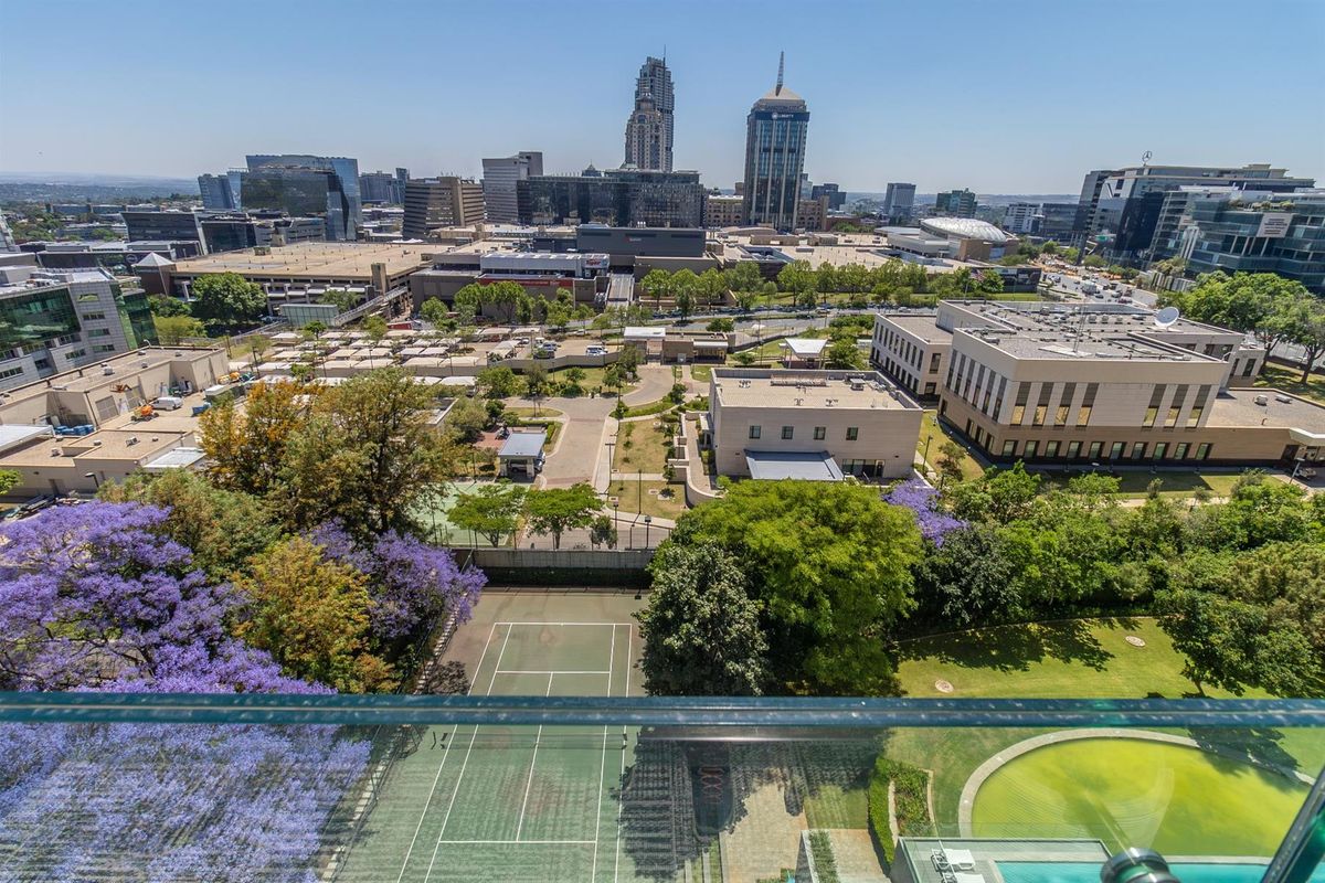 It features an open-plan living and dining area that opens onto a private balcony with stunning city views over the Sandton CBD.
