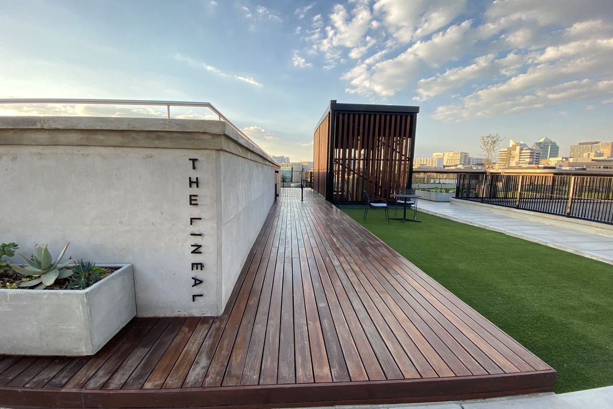 Relax in breezy urban living with a private balcony and rooftop pool offering panoramic views; open-plan lounge and kitchen, king-size bedroom with AC, one bathroom and covered parking.