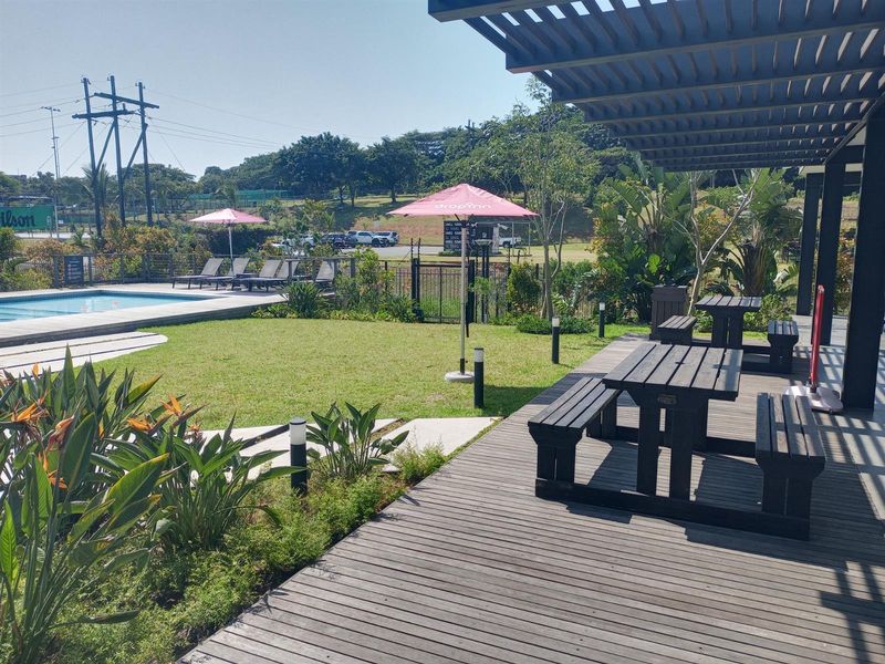 Social coastal living in Ballito Hills Estate, open-plan lounge flows to covered patio with built-in braai, ideal for entertaining. Includes one bedroom, one bathroom, storeroom and two covered parking.