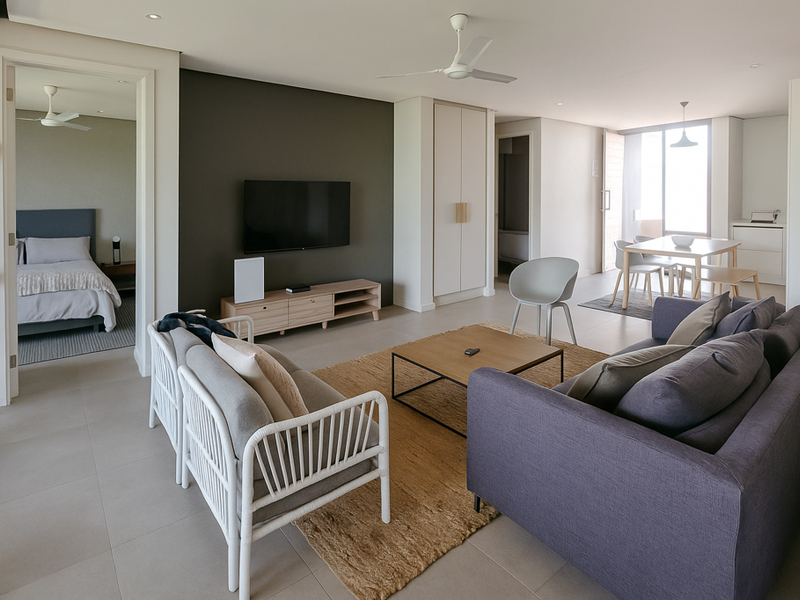 Live among ancient coastal forest with private beach-club access at Elaleni in Sheffield Beach — open-plan apartment with modern kitchen and private patio, two beds, two baths, two covered parking.