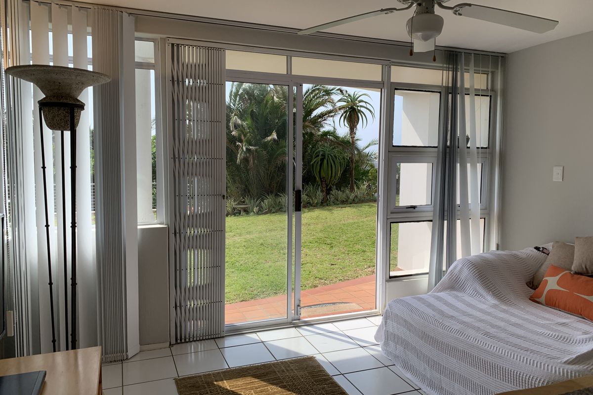 Super 1 bedroomed ground floor unit fully furnished with fitted kitchen and open plan lounge. Separate bathroom with bath and overhead shower facility. The small patio opens to common property gardens and delightful sea views. Beautiful complex pool, braai areas, laundromat facility, and security access. Walk to the beach and enjoy. Ideal lock-up and go. One allocated parking bay under cover. Visitors parking.