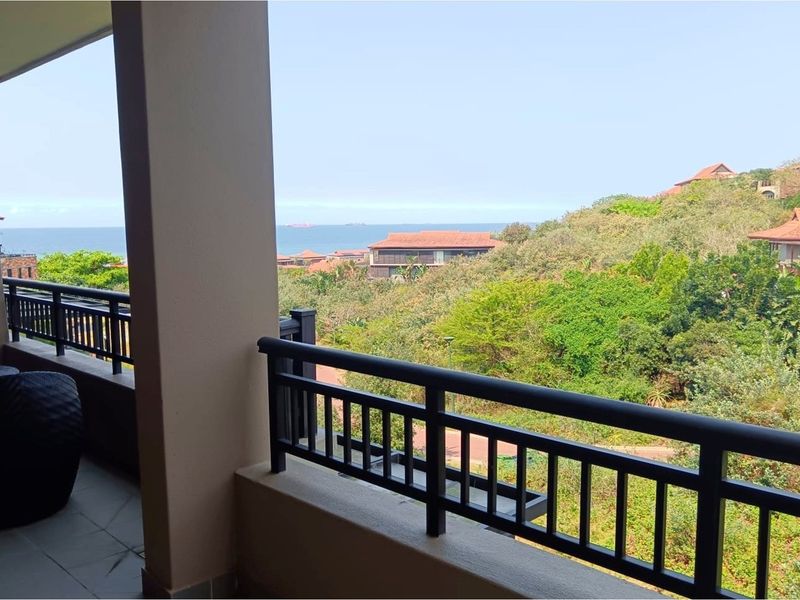Live oceanside luxury near Zimbali Capital Hotel, dining and shops — corner 2-bedroom suite with expansive balcony and panoramic sea views, secure parking and 24/7 security.