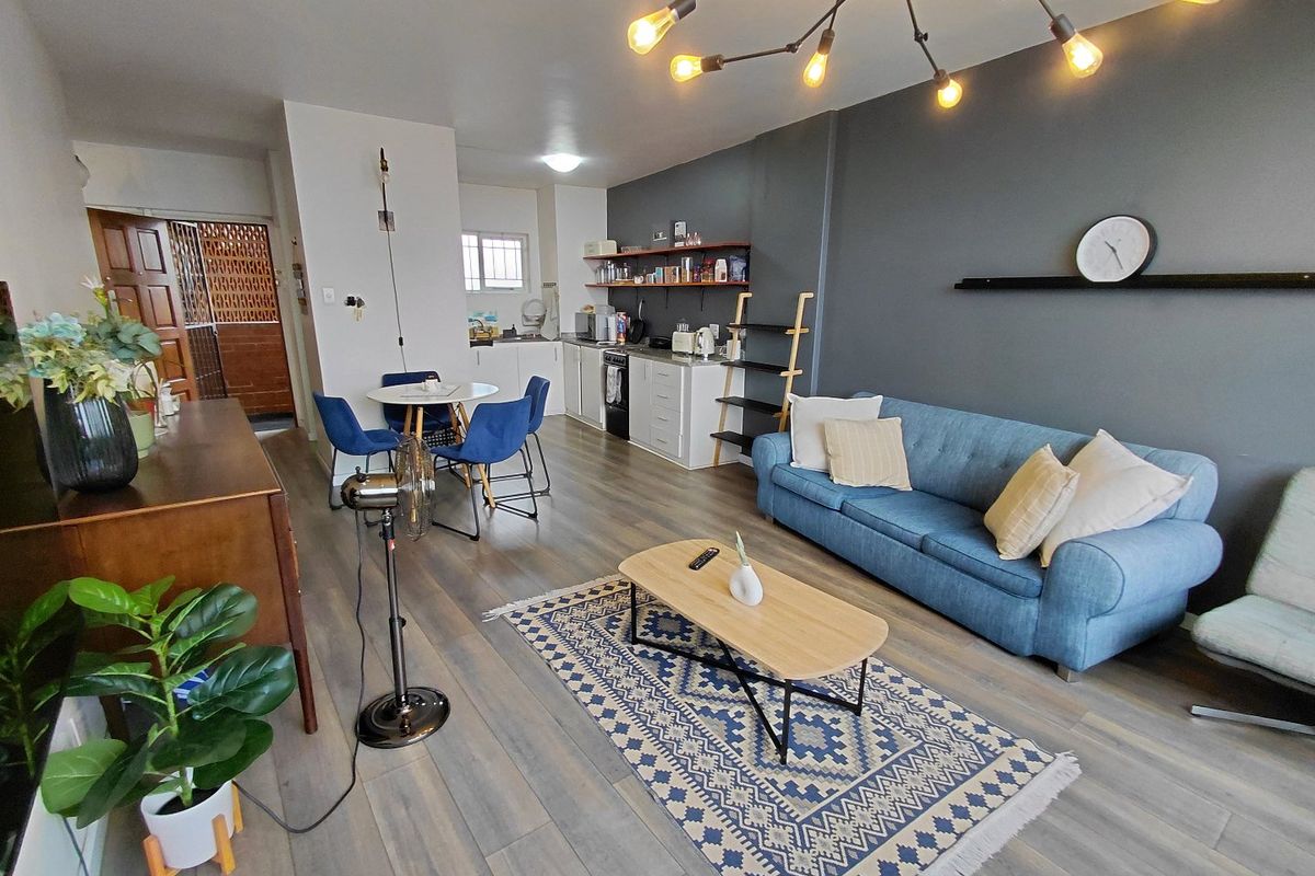Experience the perfect blend of contemporary style and urban convenience in this stunning 70 sqm east-facing apartment. Located in a well-maintained, secure complex with elevator access, this home is a masterclass in airy, open-plan living. Step onto upmarket hardwood floors that flow seamlessly through a spacious, light-filled layout. The living area features a striking charcoal accent wall and designer lighting, creating a sophisticated atmosphere perfect for entertaining. Large windows bathe the interior in morning sun and offer uninterrupted views extending over the Berea.