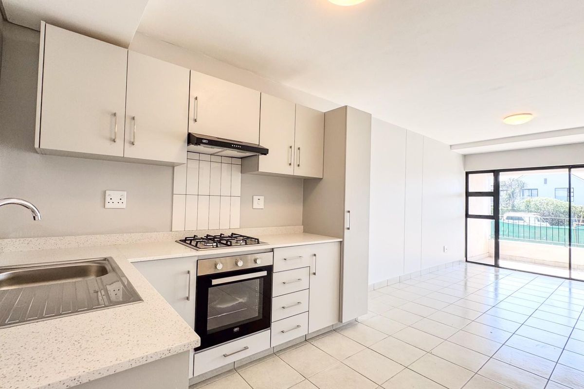 Enjoy an open-plan living area that flows seamlessly onto a private balcony—perfect for unwinding with serene estate views. The contemporary kitchen features granite countertops, built-in cupboards, a gas hob, electric oven and extractor fan.A gas geyser ensures efficient, reliable hot water.