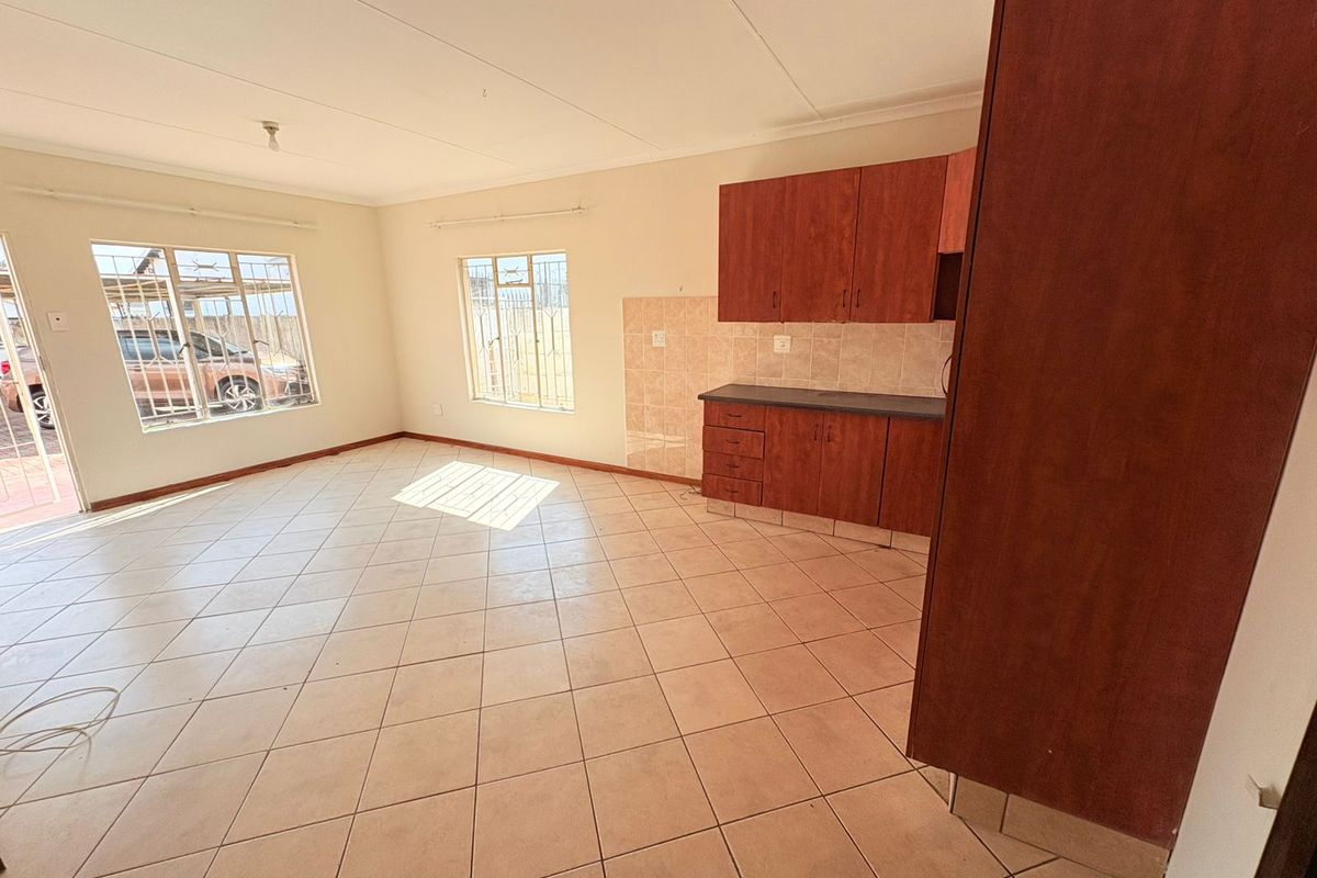 The unit features an open-plan kitchen and living area, creating a light and functional space. The kitchen includes built-in cupboards with ample storage.