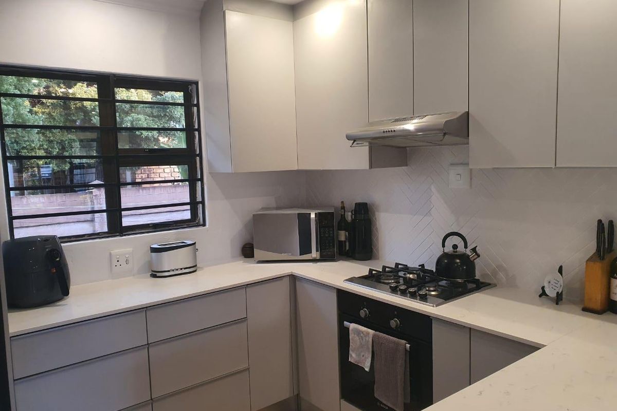 Discover this inviting 2-bedroom, 1-bathroom rental property located within a desirable complex in Birdswood, Richards Bay. The residence features a contemporary L-shaped kitchen, equipped with sleek light grey cabinetry, clean light countertops, a stylish white herringbone backsplash, a gas hob, and an integrated oven. The modern aesthetic extends to the bathroom, which boasts a spacious walk-in shower with a glass partition, rainfall shower head, built-in bench, and elegant marble-look tiles, complemented by a freestanding tub and vessel sink with black fixtures.