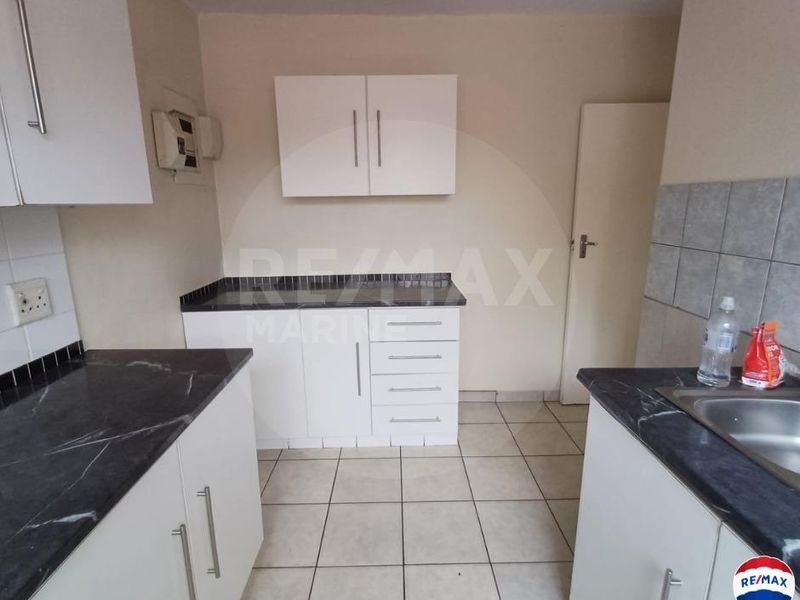 Relaxed family living in Birdswood, Richards Bay, minutes from amenities — private garden with jacuzzi, modern L-shaped kitchen and sleek bathroom. Two bedrooms, one bath, single garage.