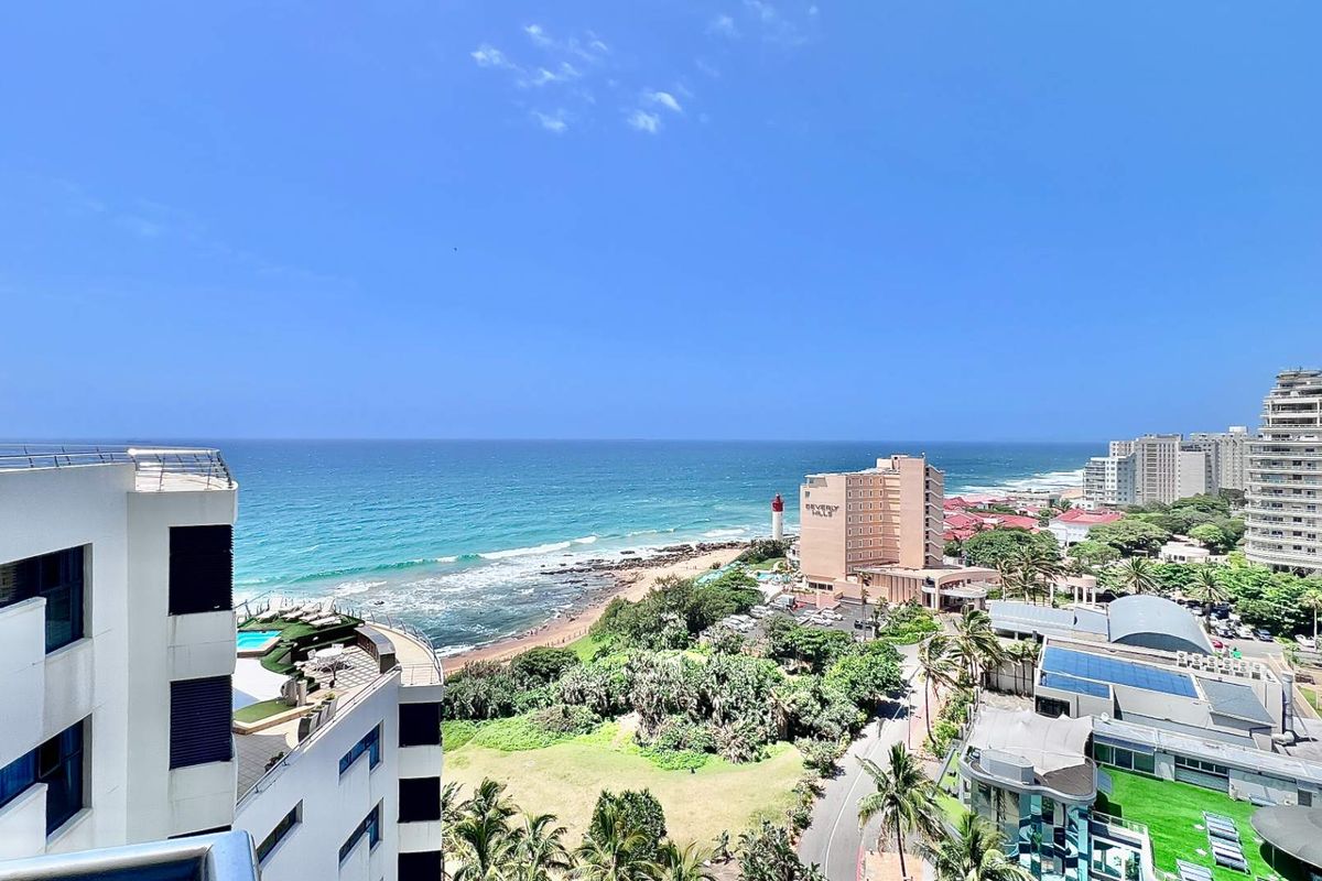 Coastal living in Pearls of Umhlanga with panoramic sea views and wrap-around balcony, easy access to promenade, mall and hotel facilities; one bedroom, 1.5 baths and undercover parking.