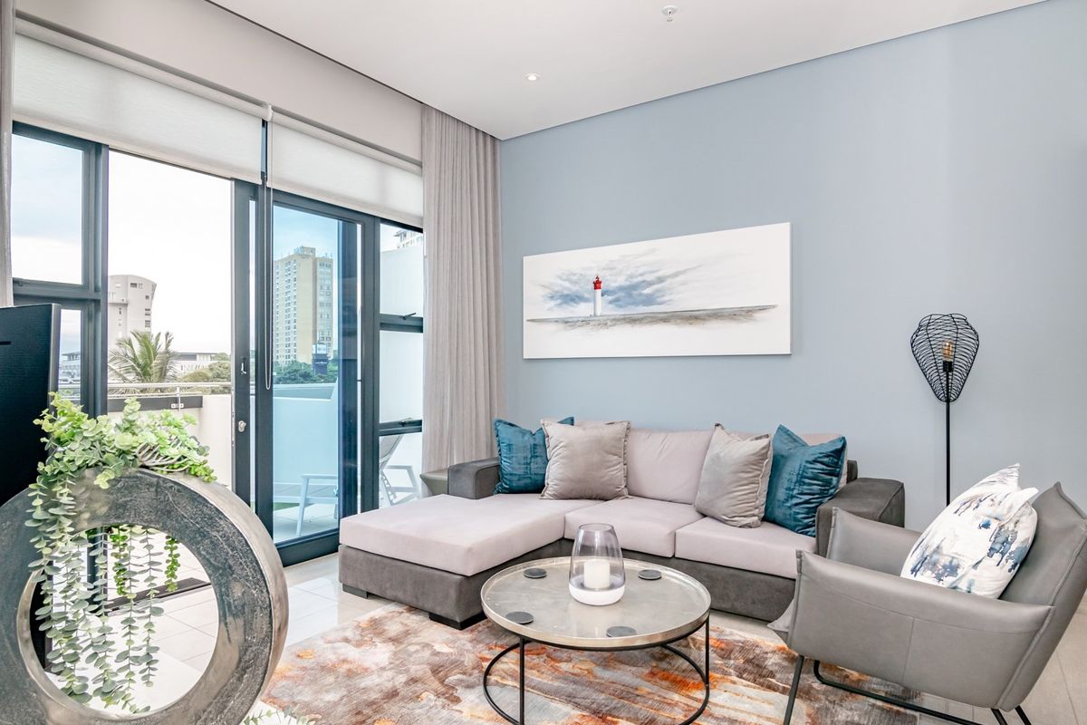 Resort-style living in Umhlanga with direct promenade access and Pearls Mall convenience; modern furnished apartment features a 38m² sea-view balcony, two bedrooms, two bathrooms and covered parking.