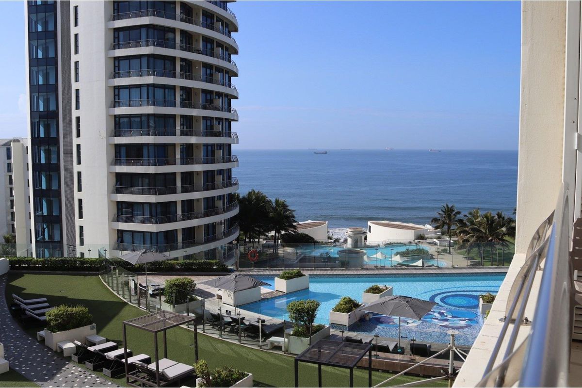 Sunset living on Umhlanga's promenade with direct mall and hotel access — fully furnished apartment featuring a stand-on balcony with partial sea views, two en-suite bedrooms and secure parking.