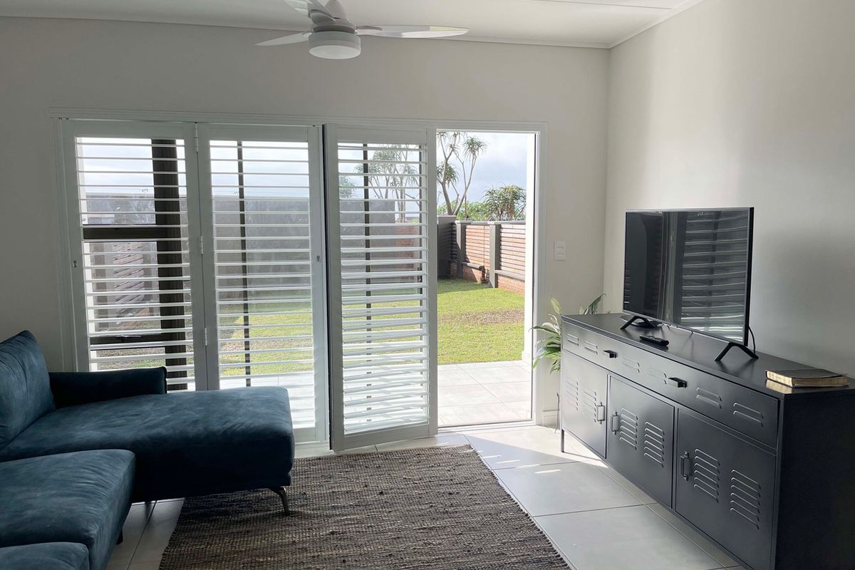 Carefree eco-estate living in Izinga Eco Estate, steps from Umhlanga shopping, beaches and major routes; furnished ground-floor apartment with private patio and garden, one bedroom, one bathroom, two covered parking.