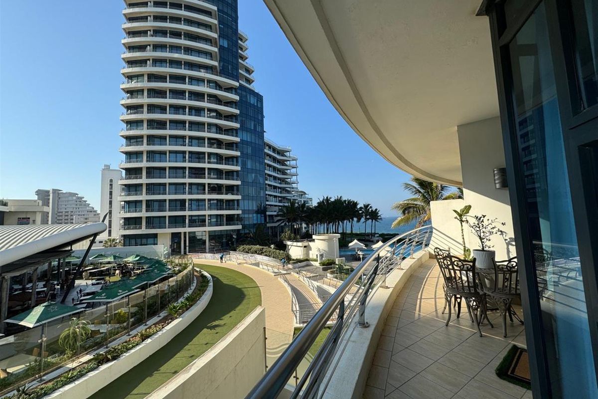 Beachfront living at The Pearls, Umhlanga — ocean views, hotel-style amenities, and access to a heated hydrotherapy pool. Private balcony, two bedrooms and 2.5 baths