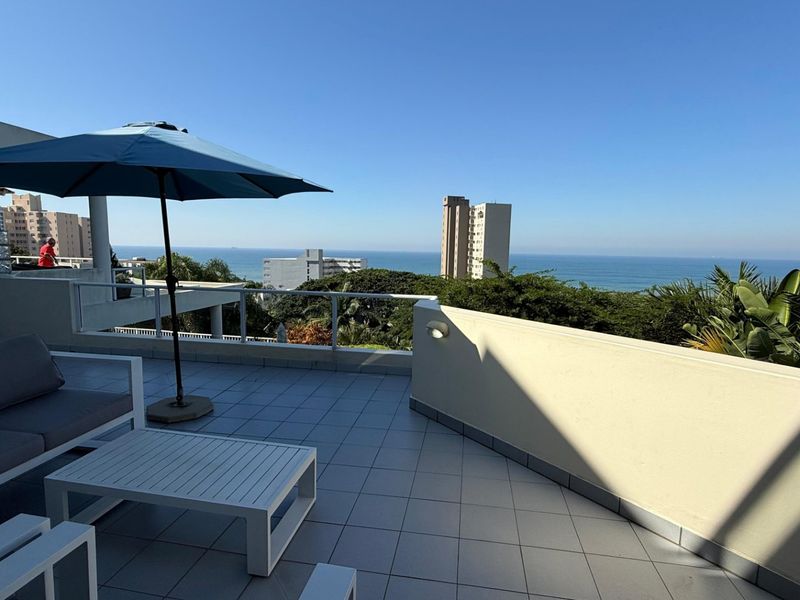 Tastefully furnished Umhlanga townhouse, a short walk from the beach and The Village yet peaceful — large ocean-view balcony, chef’s kitchen, braai patio; 3 beds, 2 baths, double garage.