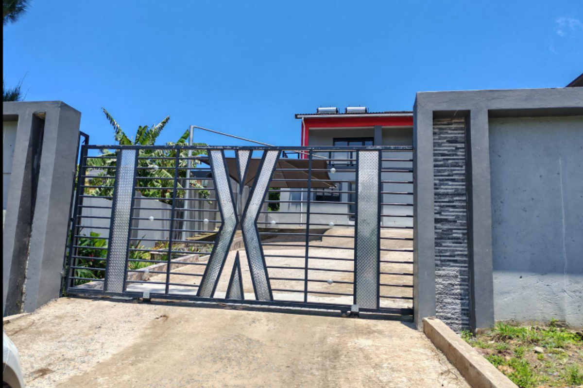 The apartment features two spacious bedrooms with fully fitted built-in cupboards and curtains throughout. The main bedroom includes an en-suite bathroom, complemented by a modern communal bathroom. The open-plan living space flows into a stylish kitchen fitted with a gas stove, solar geyser, and quality finishes—perfect for comfortable, contemporary living.