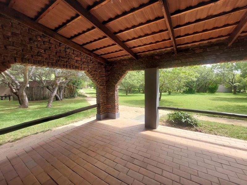 Relaxed Lowveld bush living in Kruger Foothills, minutes from Hoedspruit — covered patio overlooking trees with outdoor braai. One-bedroom, one-bath unit with open-plan living and AC.