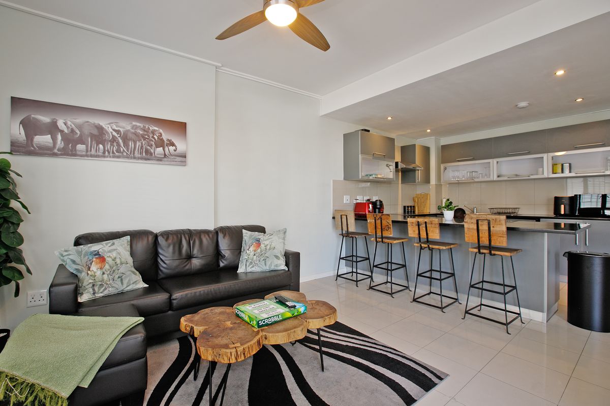 Live steps from Bree and Long Streets' dining, galleries, and nightlife on Buiten Street; fully furnished apartment with open-plan kitchen, private balcony overlooking Table Mountain, two bedrooms, secure parking.
