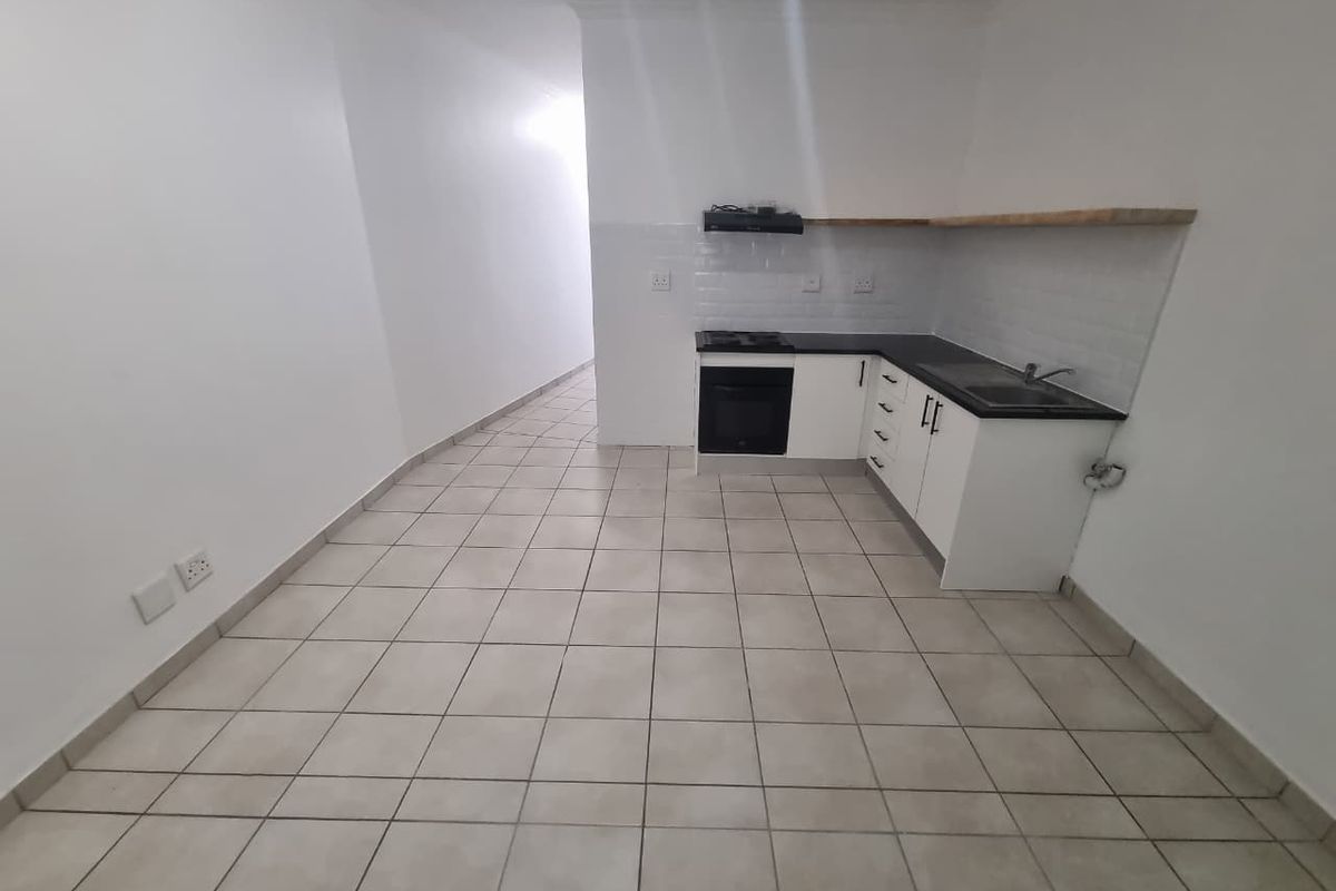 Upon entering, you are greeted by a generous open-plan kitchen, dining, and lounge area. The kitchen is thoughtfully equipped with built-in cupboards, a fitted hob, stove, and plumbing for a washing machine, offering both convenience and functionality. The living area is ideal for relaxation and entertainment.