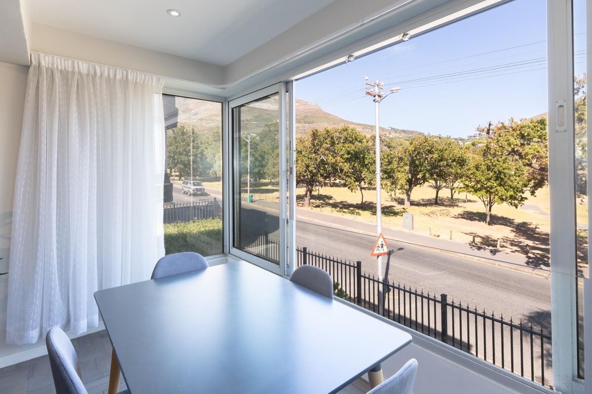 Parkside living with mountain views in Oranjezicht, walking distance to shops and transport; fully furnished two-bedroom, two-bath apartment with open-plan living and one parking bay.