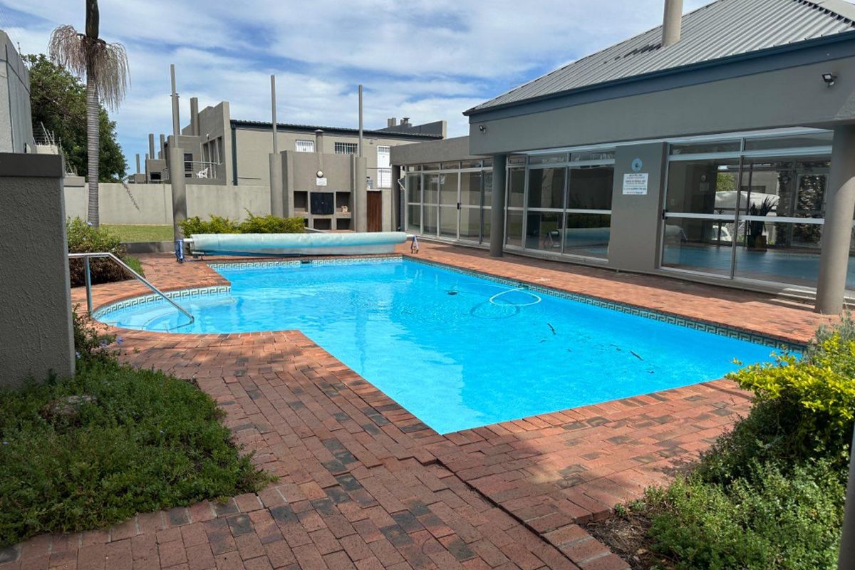 Relaxed indoor-outdoor living in a secure, community-focused complex with clubhouse and pool; ground-floor apartment features covered patio with built-in braai and private landscaped garden. Two bedrooms, one bath, covered parking.