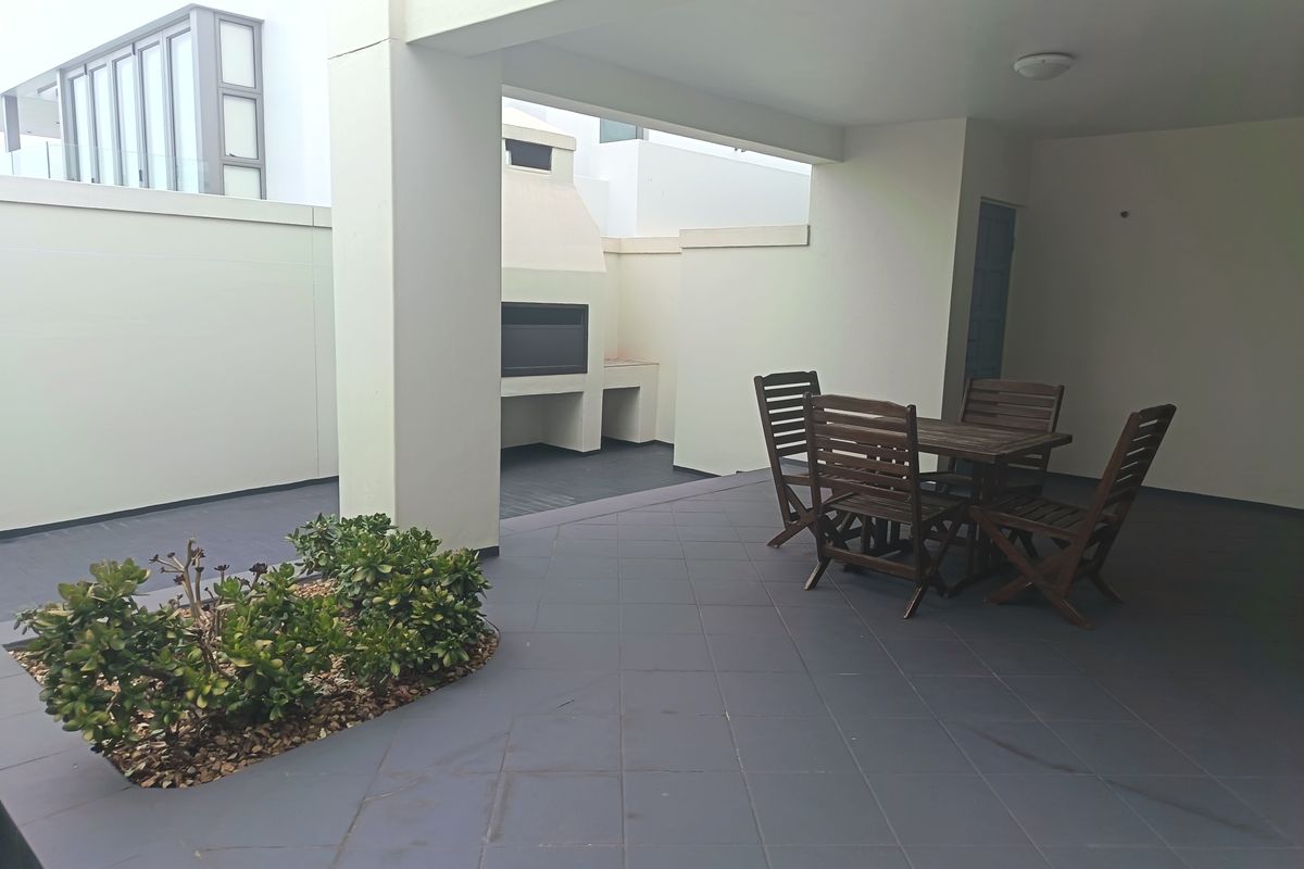 The home features an open-plan kitchen and living area that flows out to a large undercover patio with a built-in braai—perfect for entertaining. There are two large bedrooms, both fitted with built-in cupboards. The apartment offers two bathrooms: the first with a shower, and the second with both a shower and a bath.