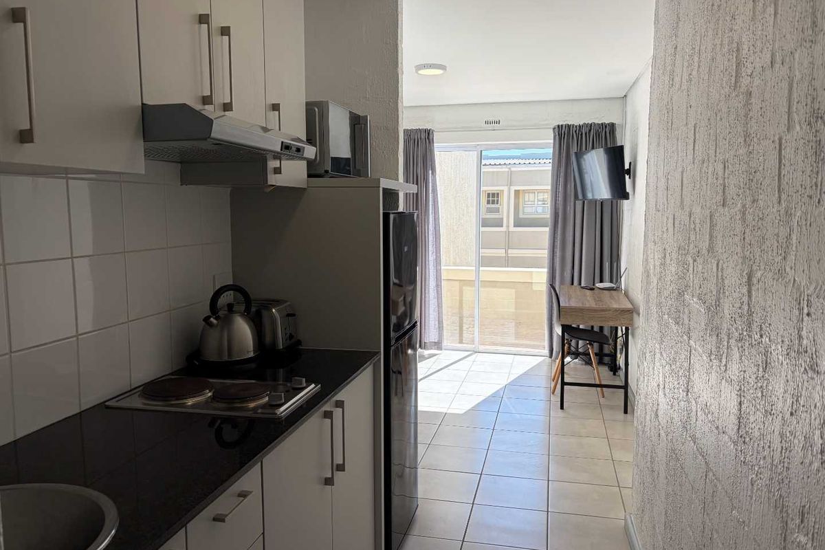 This semi-furnished bachelor unit with one en-suite bathroom apartment in La Colline, Stellenbosch is perfect for a student or young professional looking for a private space to rent. The unit is fully tiled and has modern finishes.