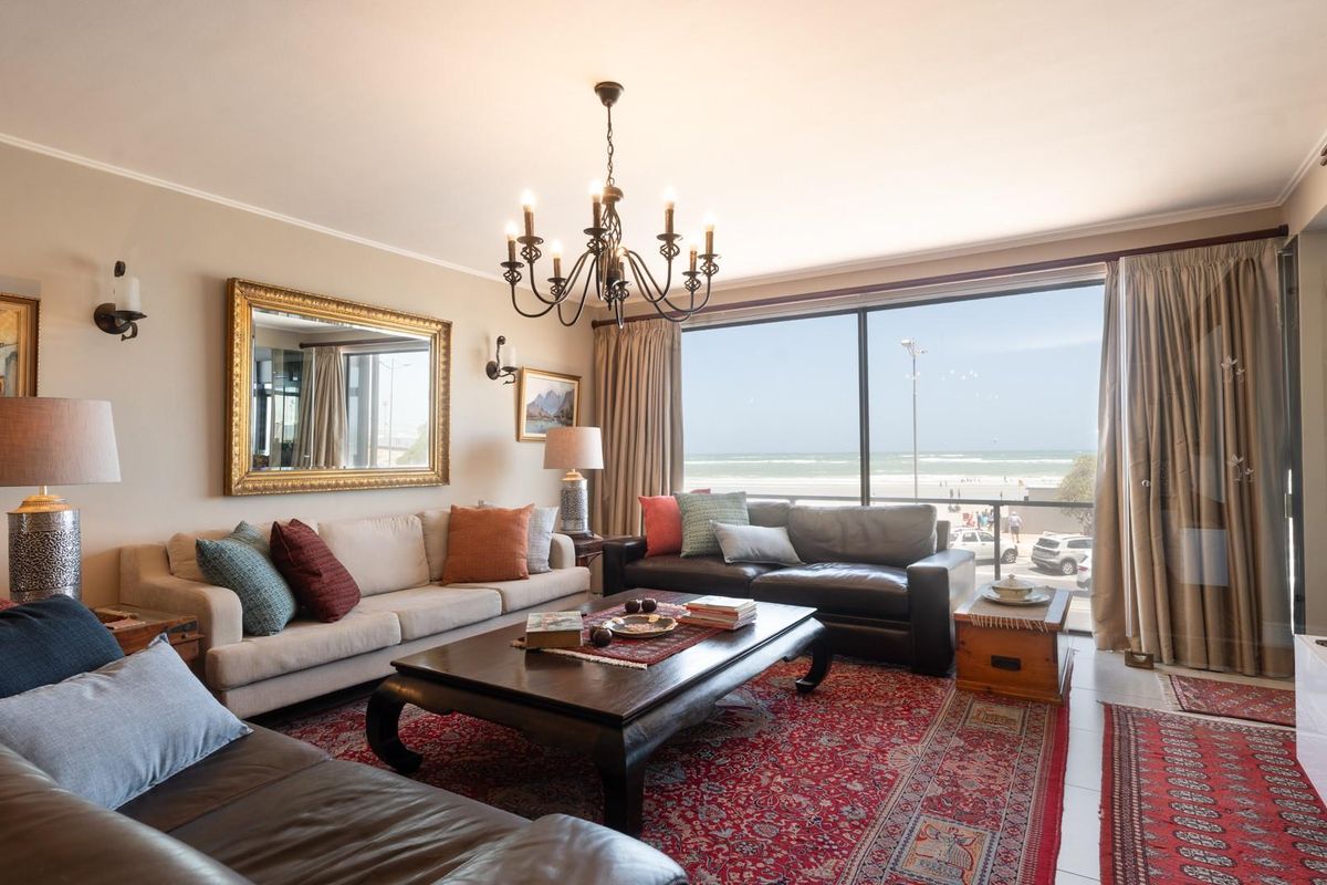 Beachfront lifestyle on Strand's Platinum Mile, steps from the Lifesaving Club and eateries; sunroom and open-plan living with sweeping 180-degree sea and mountain views. Two bedrooms, three bathrooms.