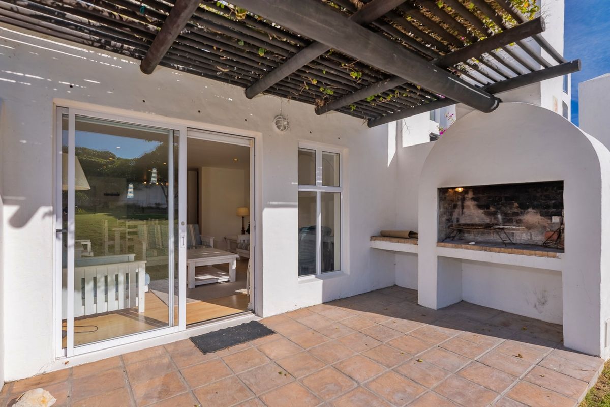 The unit features an open-plan kitchen and living area, flowing out through sliding doors to a private patio with a pergola and braai—perfect for easy indoor-outdoor living. From here, you have direct access to the communal garden and swimming pool.