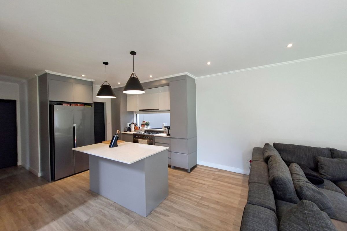 As you enter the home, you are welcomed by a stylish kitchen finished with high end fittings and striking black accessories. The kitchen features a top quality gas stove, ample cupboard space, and a separate scullery with space for three appliances, allowing the main kitchen area to remain sleek and uncluttered.