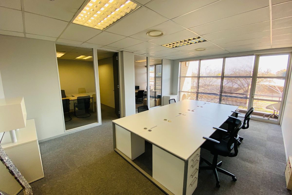 Effortless professional base in Centurion Central with art-adorned common areas, shared boardrooms and a private balcony — two private offices plus open-plan workspace, fibre and generator.