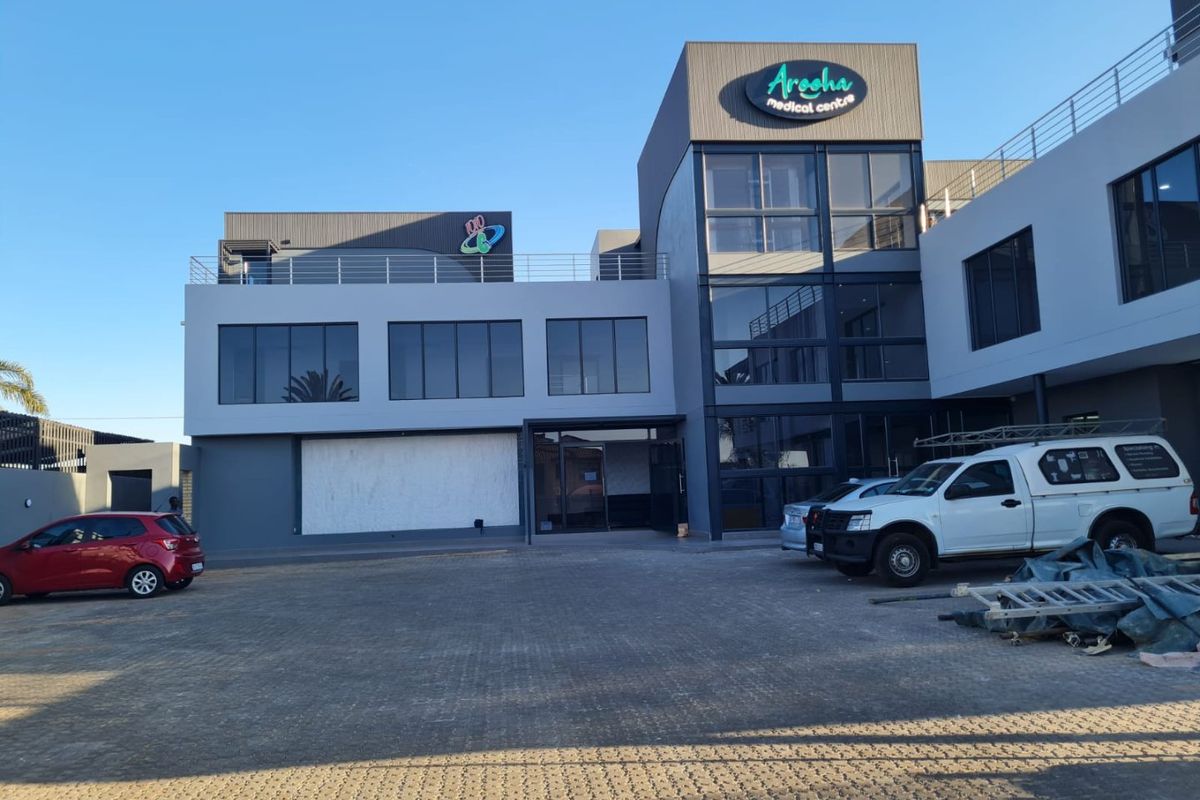 Prominent Lenasia main-road unit offering approx 100sqm of medical/retail-ready space with outside terrace, lift access, backup generators, 24-hour security and multiple entrances.