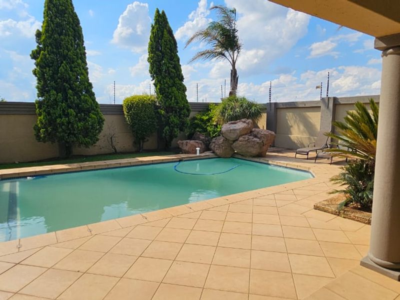 Relax in secure Sonneveld Estate with an outdoor entertaining oasis — private pool and built-in braai, cozy fireplaces and a pajama lounge. Five bedrooms, 3.5 baths, three garages.