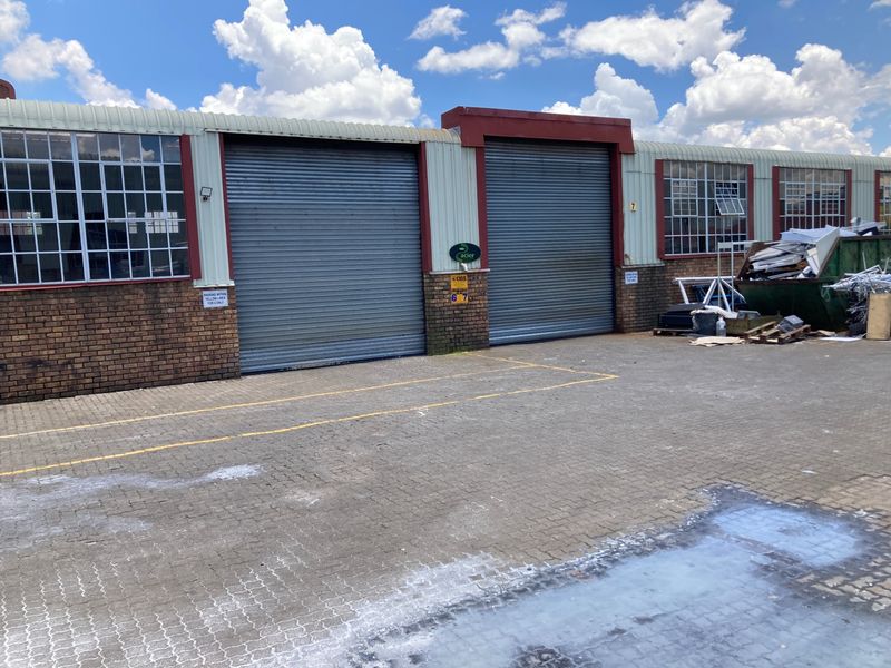 Streamlined industrial workspace in a secure small complex, ideal for manufacturing or storage; features a large roller-door, two offices, two ablutions, kitchen, change room, and two covered carports. 230 m²