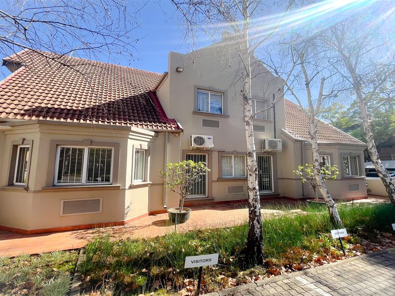 Operate from a serene, secure office park near Rosebank and the M1, blending heritage high ceilings and wooden flooring with private first-floor balconies; 350m², three bathrooms.