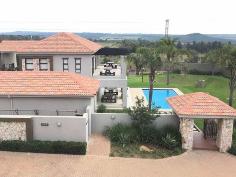 Relax and entertain in secure Grange Park living in Barbeque Downs, Midrand — private patio with Kyalami views, communal pool and braai; comfortable two bedrooms, two bathrooms.
