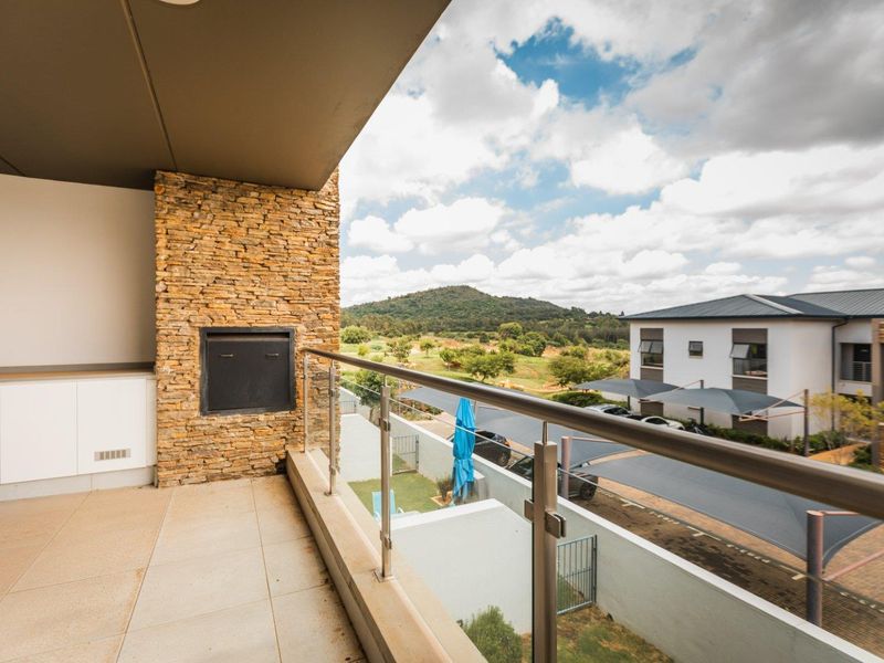 Relaxed estate living with walking trails and dining nearby at Eye of Africa, private balcony with river and golf course views; open-plan kitchen, three bedrooms, two bathrooms.