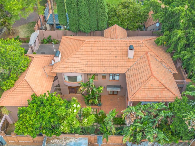 Entertain effortlessly in Jacaranda-lined Muckleneuk with expansive living areas, roofed entertainment deck, Jacuzzi and pool, private garden retreats — six bedrooms, five bathrooms, four-car garage.