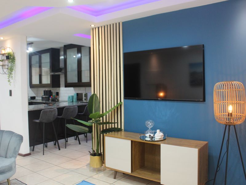 Relax in a centrally located retreat ideal for effortless entertaining — pool and braai area, full backup power, cozy lounge with smart TV; two bedrooms, one bathroom, two covered parking.