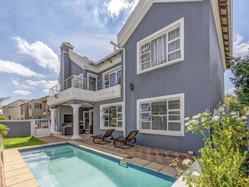 Entertainer's family retreat with pool and balcony living in sought-after Broadacres estate, close to Chartwell Corner and Fourways Mall, top schools and Lanseria. Five beds, three baths, three garages.