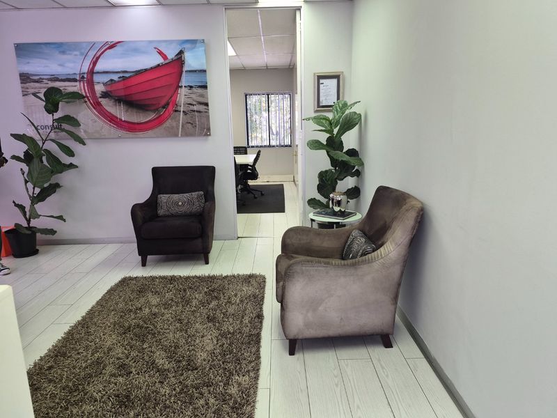 Command a premium Bryanston address with seamless access to Sandton and major routes — high-end fitted first-floor office featuring a balcony with tranquil park views and ample parking.