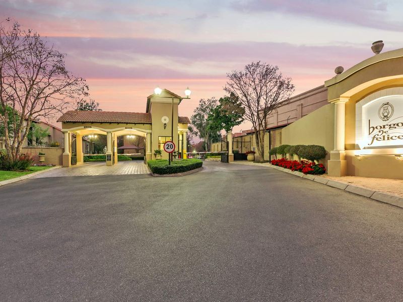 Resort-style living in Borgo de Felice, adjacent to Dainfern Valley — furnished loft unit with gas fireplace and dedicated balcony. Two bedrooms, two bathrooms, covered and open parking.